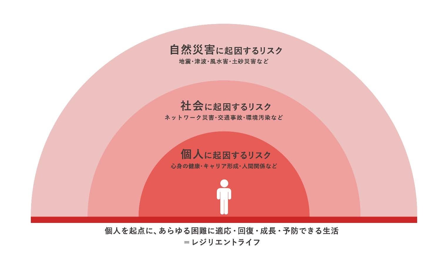 ⾃然災害のリスクをはじめ、社会に起因するリスク、そして個⼈に起因するリスクに⾄るまで、あらゆるリスクが⽣み出す困難を乗り越えるための「レジリエンス」を⾼め、より豊かな⽣活の実現を⽬指す、新しいライフスタイルです。