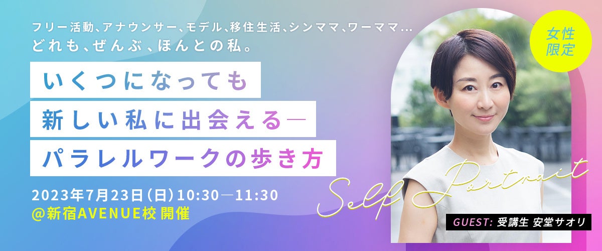 今回のイベントは「【Self Portrait vol.1】 いくつになっても新しい私に出会える―パラレルワークの歩き方」と題し、フリーアナウンサーとして仕事を続けながら、シングルマザー向けの給付金を活用し受講生としてWebスキルを学ぶ安堂サオリさんをゲストにお迎えするトークイベントです。パラレルワーク、キャリア形成のポイント、シンママ・ワーママのリアルなど、自分で歩む女性のライフスタイルの本音に迫ります!