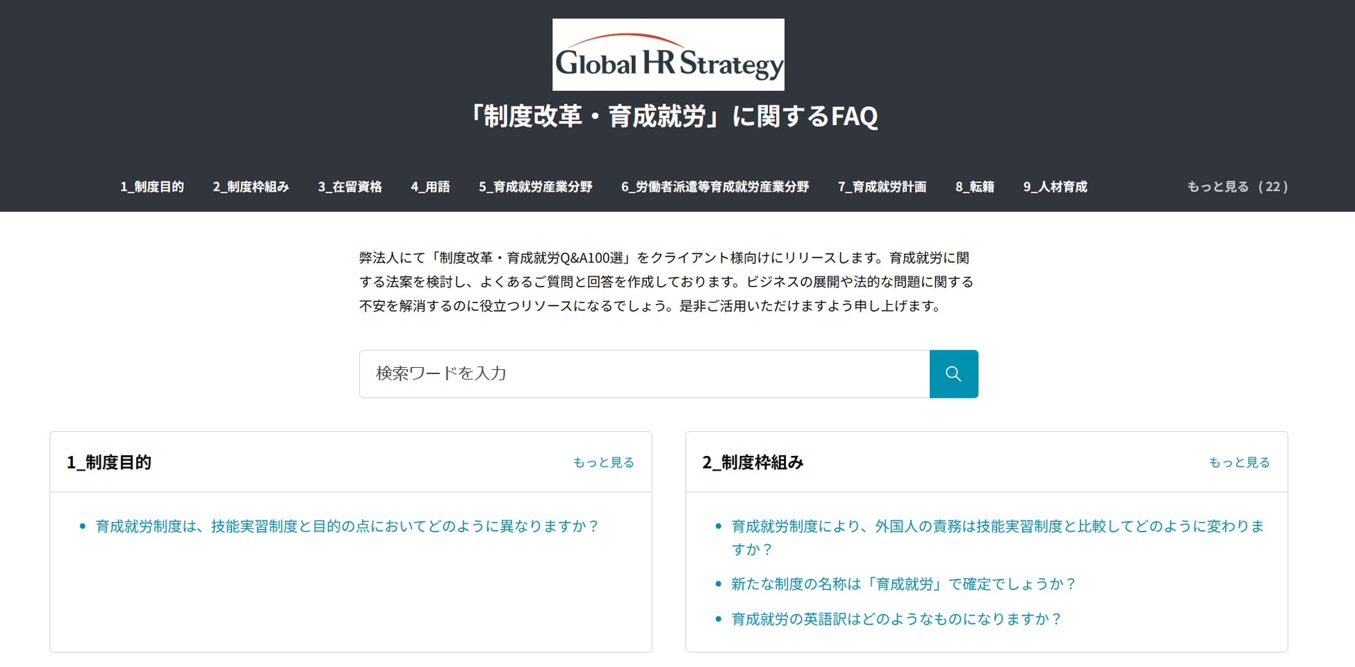 まずは注目度の高い育成就労に関する法案を専門家が検討したFAQ「制度改革・育成就労Q&A100選」を公開しました。各質問と回答は「制度目的」、「制度枠組み」、「育成就労産業分野」といった様々な項目に分けて掲載されており、必要な情報を効率的に入手できます。今後、外国人雇用に関するFAQをさらに充実させてまいります。