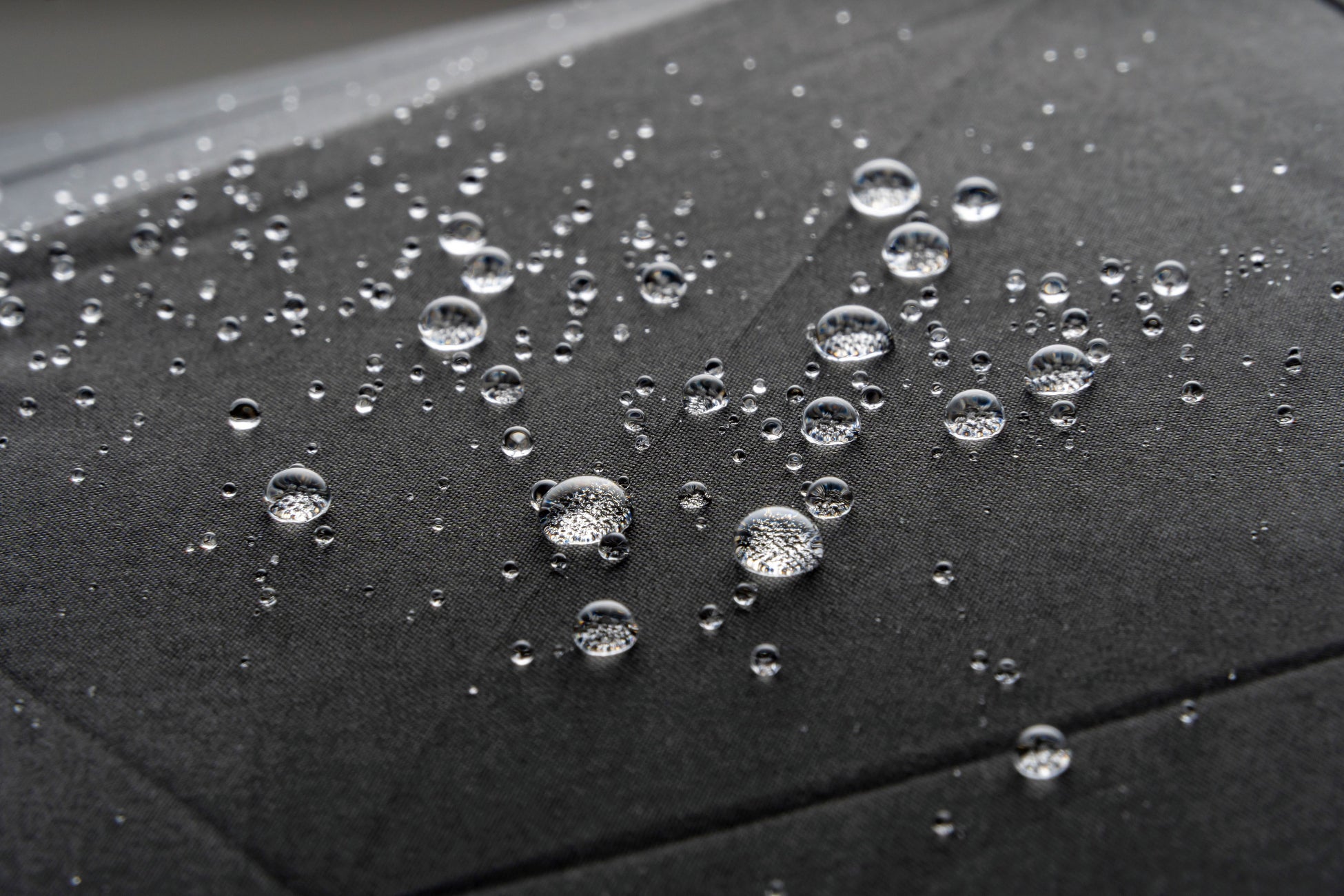 生地には、撥水性に優れたケマーズ社製テフロン加工を施しています。軽く振るだけで優れた水はけを体感することができ、撥水性が優れているためカバンの中に入れても他のものを濡らしてしまう心配も少ない商品です。