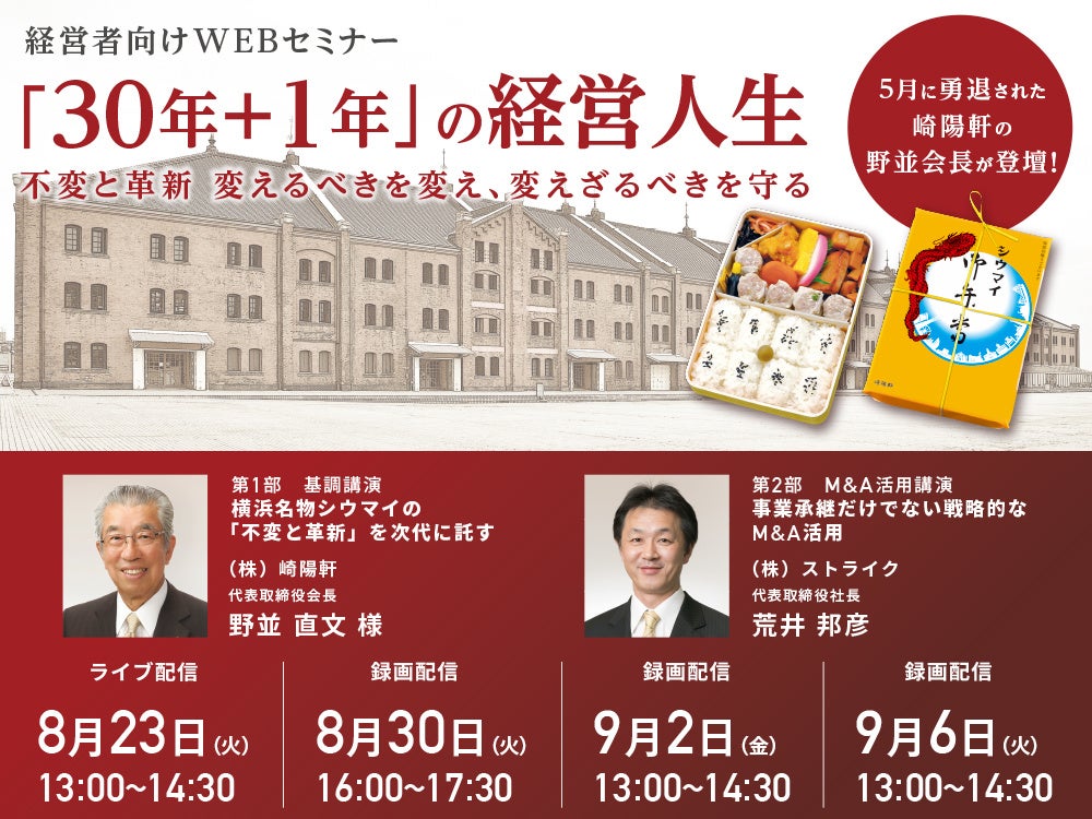本セミナーでは(株)崎陽軒の野並直文会長ををお招きし、コロナ禍、社長交代のタイミング、事業承継の準備についてお話しいただきます。また、創業から114年という老舗企業でありながら新しく柔軟な発想で挑戦し続ける秘訣についても伺います。