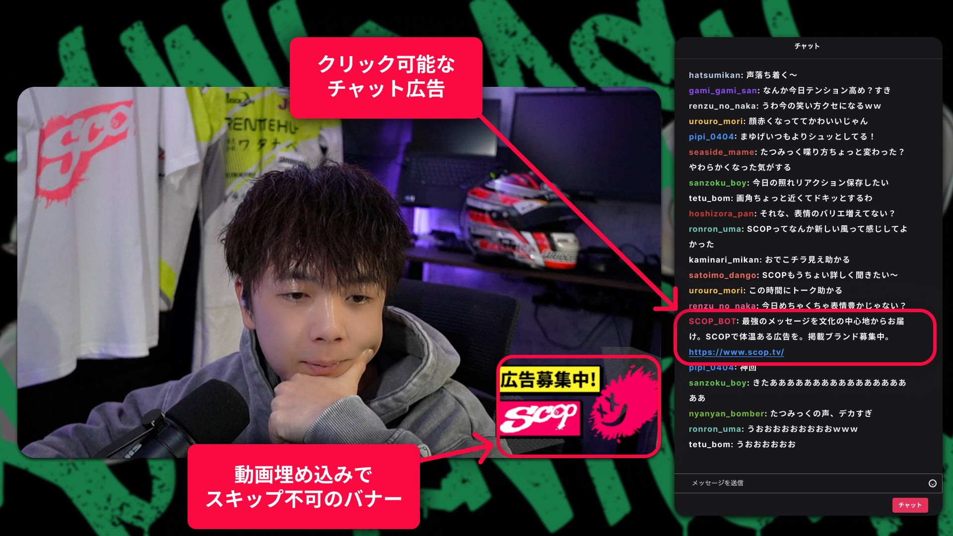 SCOPは、ストリーマーが能動的にブランドを応援しファンマーケティングを行う新しいマーケティングソリューションです。