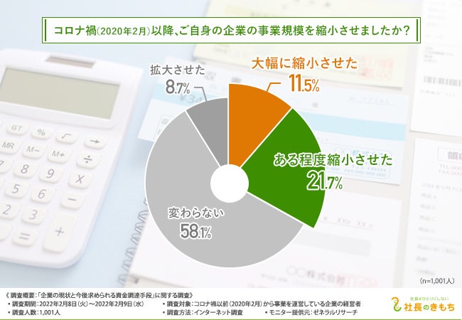 「コロナ禍(2020年2月)以降、ご自身の企業の事業規模を縮小させましたか?」と質問したところ、『大幅に縮小させた(11.5%)』『ある程度縮小させた(21.7%)』『変わらない(58.1%)』『拡大させた(8.7%)』という結果となりました。