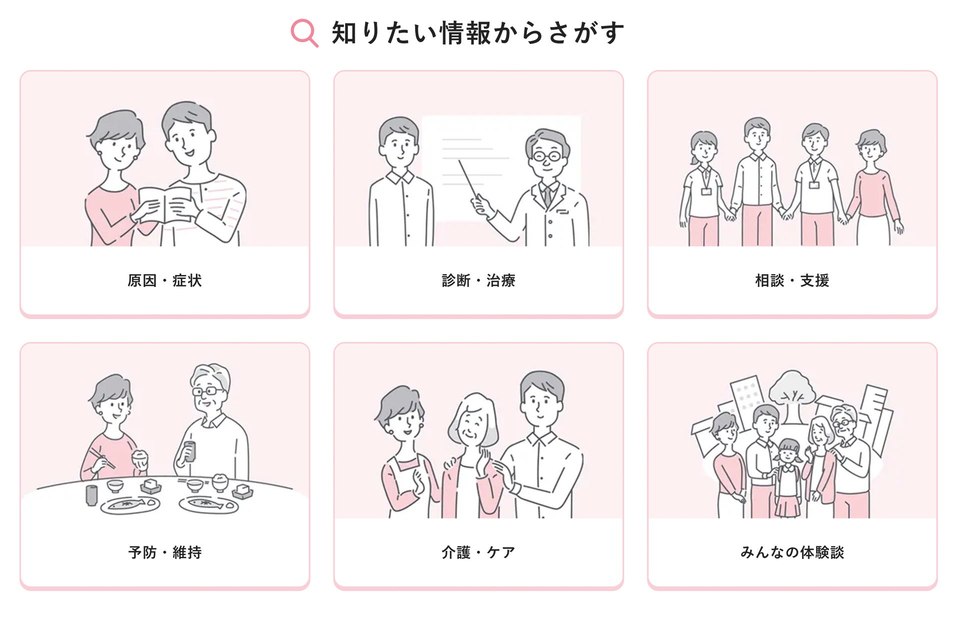「相談e–65(そうだんイーローゴ)」では、認知症に関する相談や治療に対応している「医療機関」を検索いただける「もの忘れ相談ナビ」のほかに、認知症に関する基礎知識、認知機能の維持・向上の対策、介護方法、体験談、体と脳を活性化するデュアルタスクの運動プログラム「ブレパサイズ」など、認知症と歩む皆様に向けた情報を掲載しています。