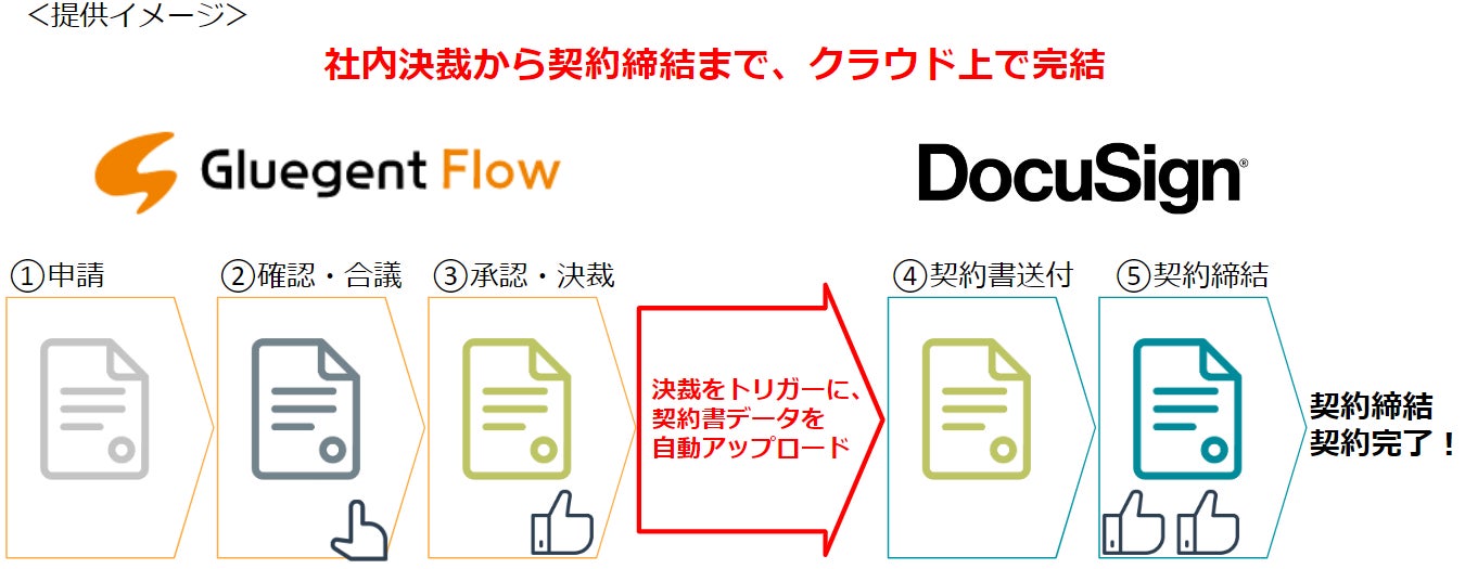 「Gluegent Flow / Gluegent Flow Plus」は、申請・承認・決裁といった一連の社内業務をクラウド化したワークフローシステムです。一方、ドキュサインは世界180ヶ国100万社以上に導入され、10億人以上のユーザーが使用*3する「DocuSign eSignature」を中核とした電子署名サービスを提供しています。両サービスを連携した「Gluegent Flow / Gluegent Flow Plus 電子契約連携 for ドキュサイン」では、システム間を自動連携することで人的ミスをなくし、社内稟議から締結までの業務プロセスを一気通貫に行います。また、国内外で広く利用されているドキュサインとの連携は、海外法人契約との契約手続を迅速かつ円滑に行うことが可能です。本サービスの活用によって、クラウド上での一元管理による業務プロセスの可視化、業務の効率化が可能となり、契約関連業務のDXに貢献します。