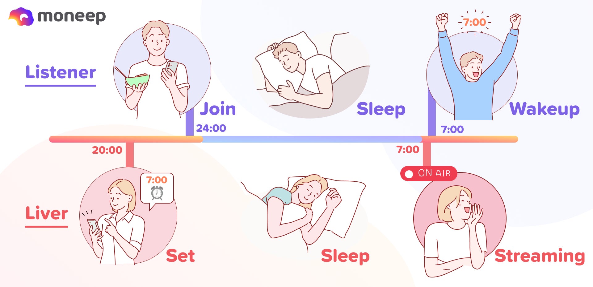 moneepは朝を知らせるツールであるアラームと、人を繋げるライブ配信を組み合わせることで、社会的でエンターテイメント性の高い目覚めを実現します。寝ているリスナーはまるで【同じ部屋にいる推しに起こしてもらう】ような体験を得ることができ、ライバーも朝というスキマ時間に新しい自己表現、エンタメを自分のファンに提供する事ができます。