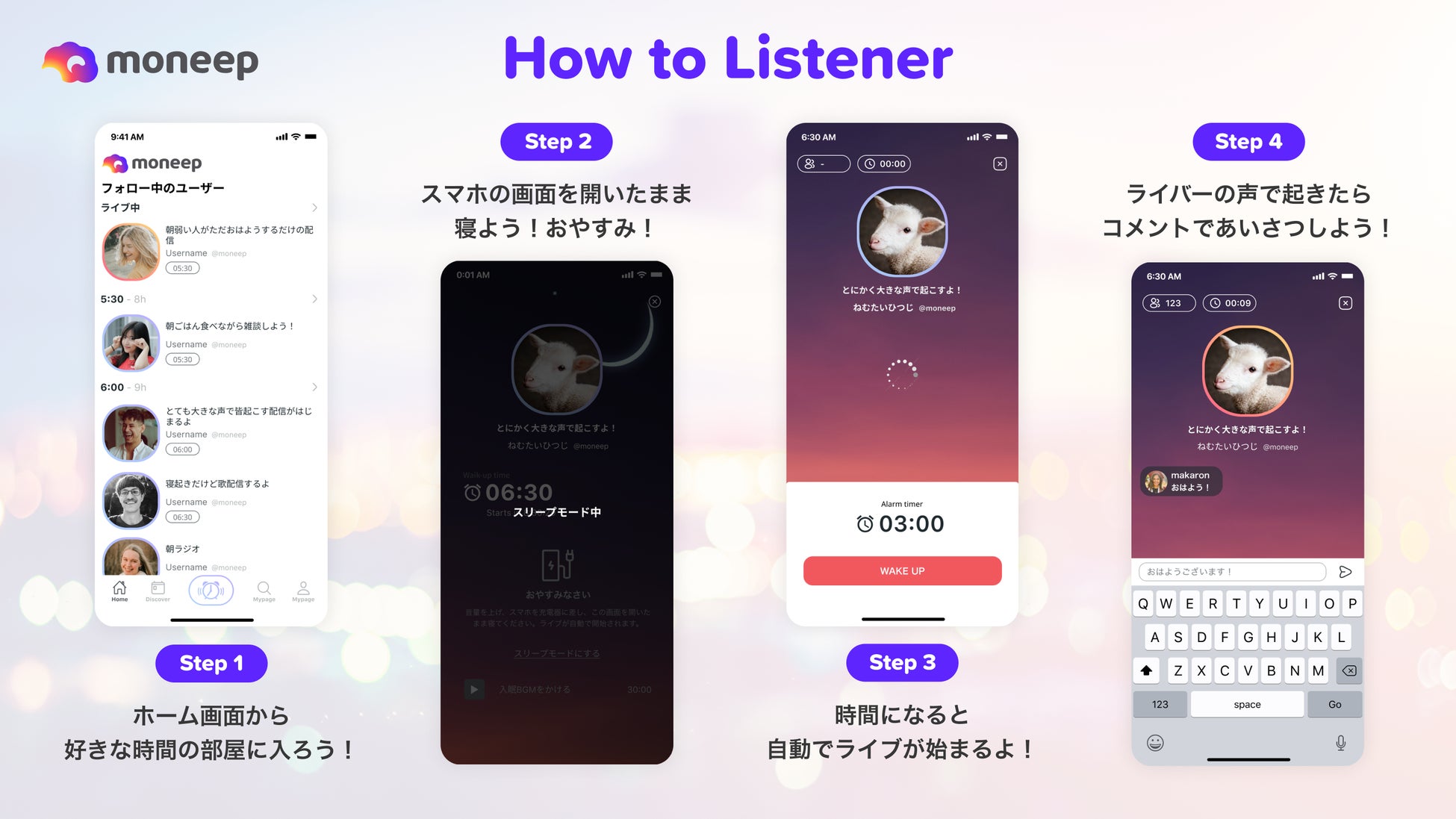 moneepは自動でライブ配信を開始し、リアルタイムでコメントを受け付ける機能を備えています。リスナーは起きてすぐにライバーとコミュニケーションを取ることができます!