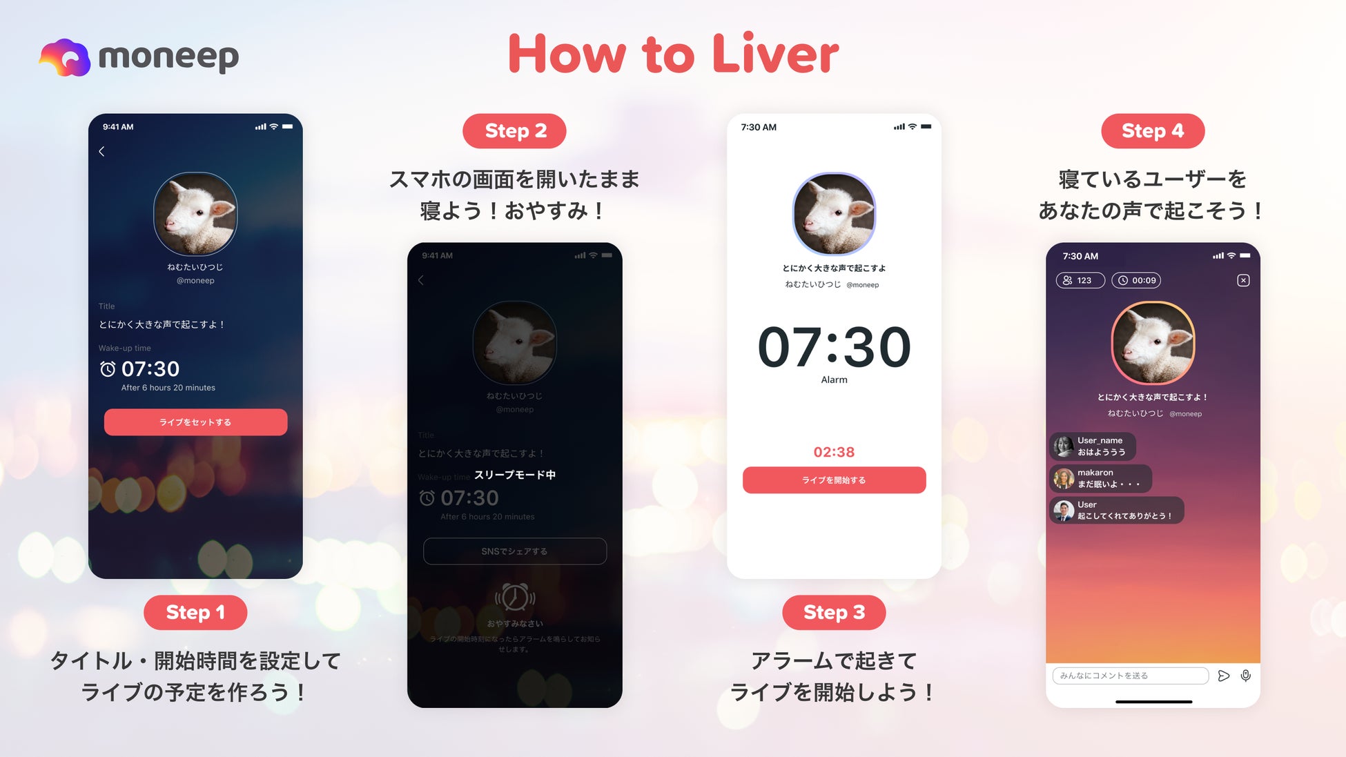 株式会社moneep(本社:東京都千代⽥区、代表取締役CEO:堀⼝ 凌佑)は、アラームのように自動でライブ配信の視聴が始まり、ライバーのリアルタイムの声で起床できるアラームライブ配信アプリ【moneep(モニープ)】のiOS版とAndroid版を本⽇2024年2月29日より、全世界に向け配信開始致しましたので、お知らせ致します。私達moneepは、“おはようをすべての朝に”をミッションに、世界中の⼈々の⽬覚めを繋ぎ、朝の時間をよりポジティブものに変え、今までにない新しい価値体験を創出して参ります。