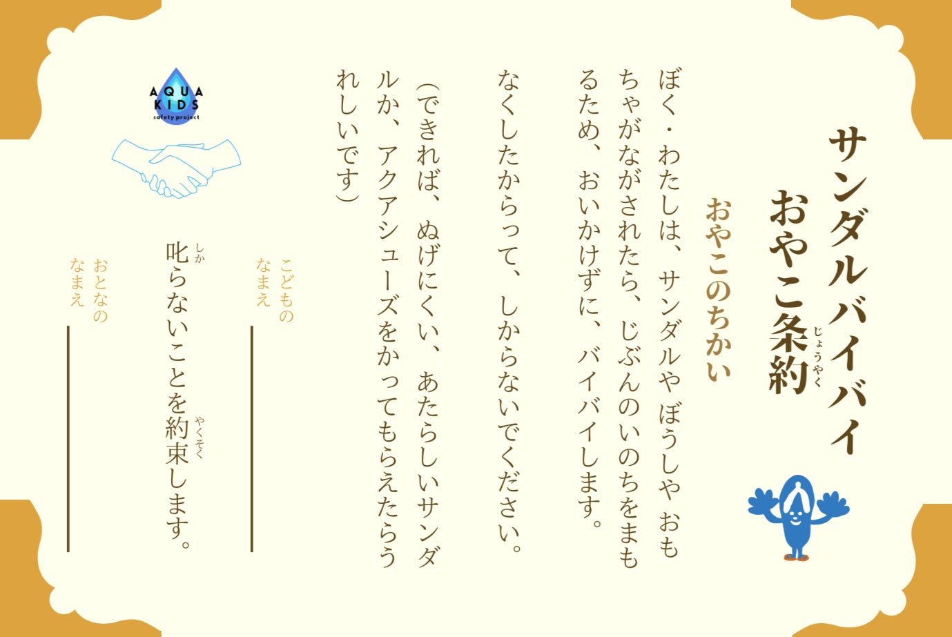 そして、安全な水辺でのレジャーを楽しむためにも、ぜひ「サンダルバイバイ親子条約証書」について取材のご検討をよろしくお願いいたします。