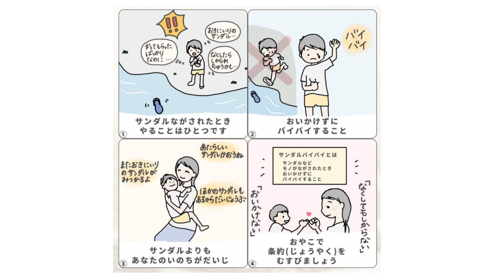 流されたサンダルなどを追いかけて溺れる⽔難事故を予防するキーワード。(流されたサンダルなどを 追いかけて溺れる⽔難事故は6年連続で発⽣しています。当法⼈調べ。)サンダルは買えても、命は買え ません。「流されたサンダルはバイバイしよう」サンダルバイバイには、これまでTwitter上で3000以上 のいいね!がつき、関連動画再⽣回数は10万回以上で、現在も更新中です。「流されたモノは追いかけない」という事故予防のアクションに、直接繋がりやすいキーワードとして、公⽴⼩学校の教材としても活⽤されています。