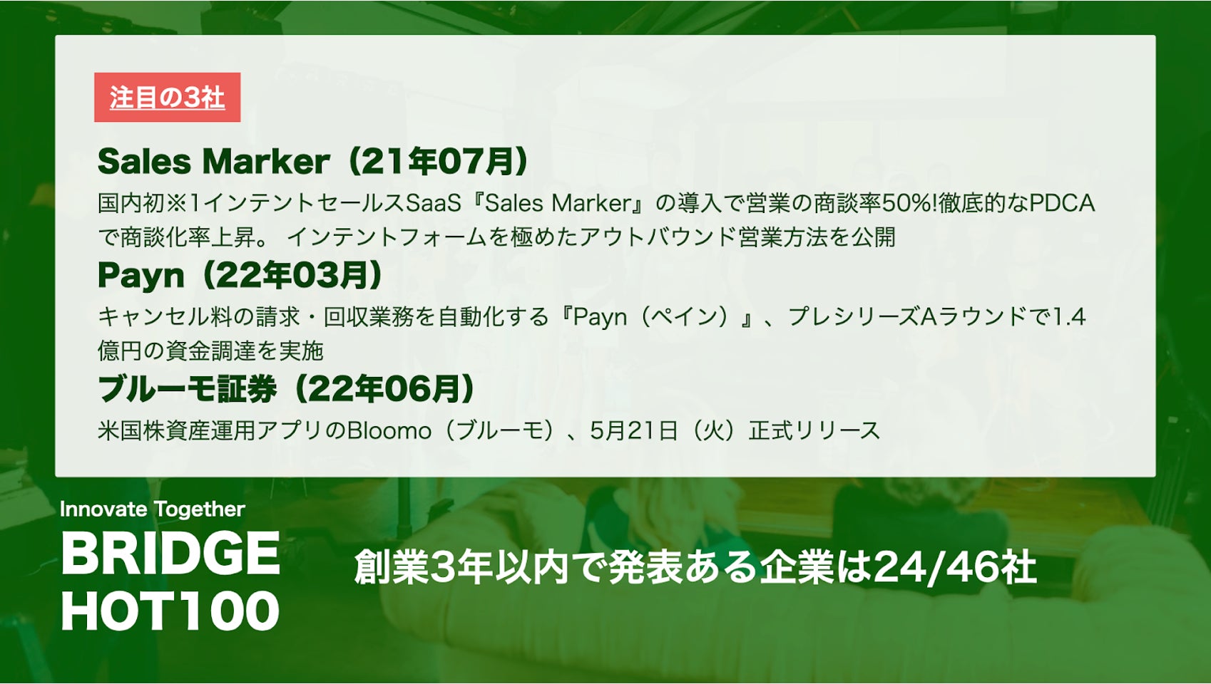 注目のスタートアップをチャート配信「BRIDGE HOT 100」6月集計を公開 6割超がDX・R&D・小売。「MUFG Innovation Partners」支援先を対象に追加
