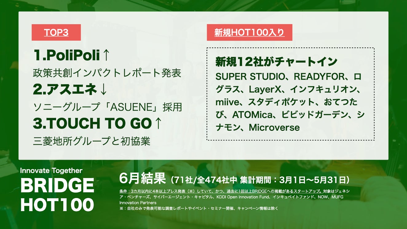 株式会社 PR TIMES(東京都港区、代表取締役:山口拓己、東証プライム:3922)の子会社でスタートアップメディア「BRIDGE」事業を運営する株式会社THE BRIDGE(東京都港区、代表取締役:平野武士)は2024年6月21日(金)、スタートアップ(*1)の情報発信の実績をもとに、事業活動を定量的に集計したチャートコンテンツ「BRIDGE HOT 100」の6月集計結果を配信いたしました。