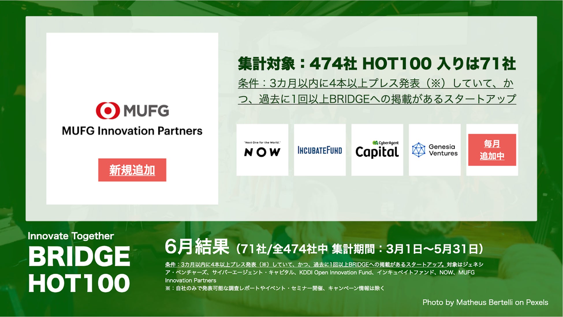 「BRIDGE HOT 100」では、直近3カ月のプレスリリースによる情報発信や過去の「BRIDGE」掲載実績を集計し、上位最大100社リストアップし、2024年4月から毎月公開しています。6月からはシード期にあたる創業3年以内のスタートアップを集計したチャートも発表いたします。集計対象は「MUFG Innovation Partners」の支援先を追加し、474社となりました。