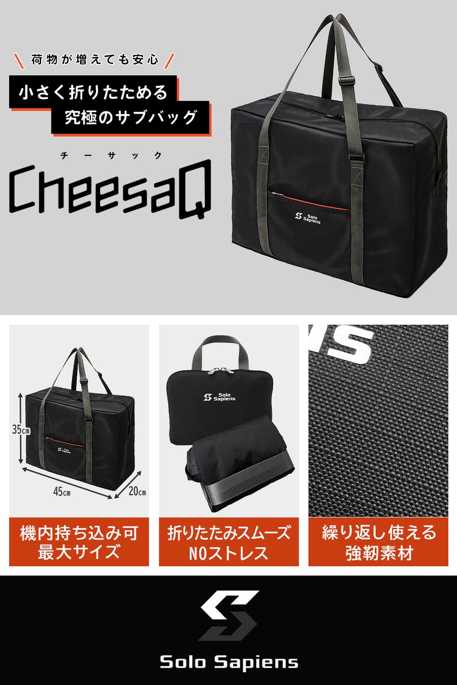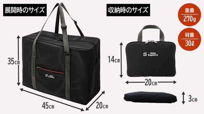 世界一周したバックパッカーである創業者の経験をもとに、快適でスマートな旅を実現するための機能や品質を追求した旅行アイテムを展開する、ソロサピエンス。新商品のCheesaQ〈チーサック〉は、小さく折りたためる携帯用の超軽量ボストンバッグです。旅先での散策時や、お土産などの荷物が増えてしまったときに、サッと取り出しサッと使える究極の使い勝手を目指して誕生しました。容量は、国内線の機内持ち込みが可能な30L。たためば手のひら大のコンパクトサイズで、重さはわずか270g。手持ち、肩掛け、キャリーケース固定の3ウェイに対応するなど、旅先でのニーズをあらゆる面から追求した究極のサブバッグです。