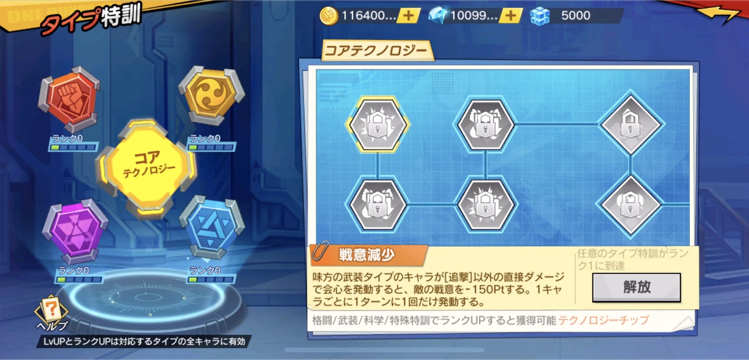 また、「タイプ特訓」で強化を進めていくことで、バトルを有利に進めることができるコアテクノロジーも解放していくことができます。