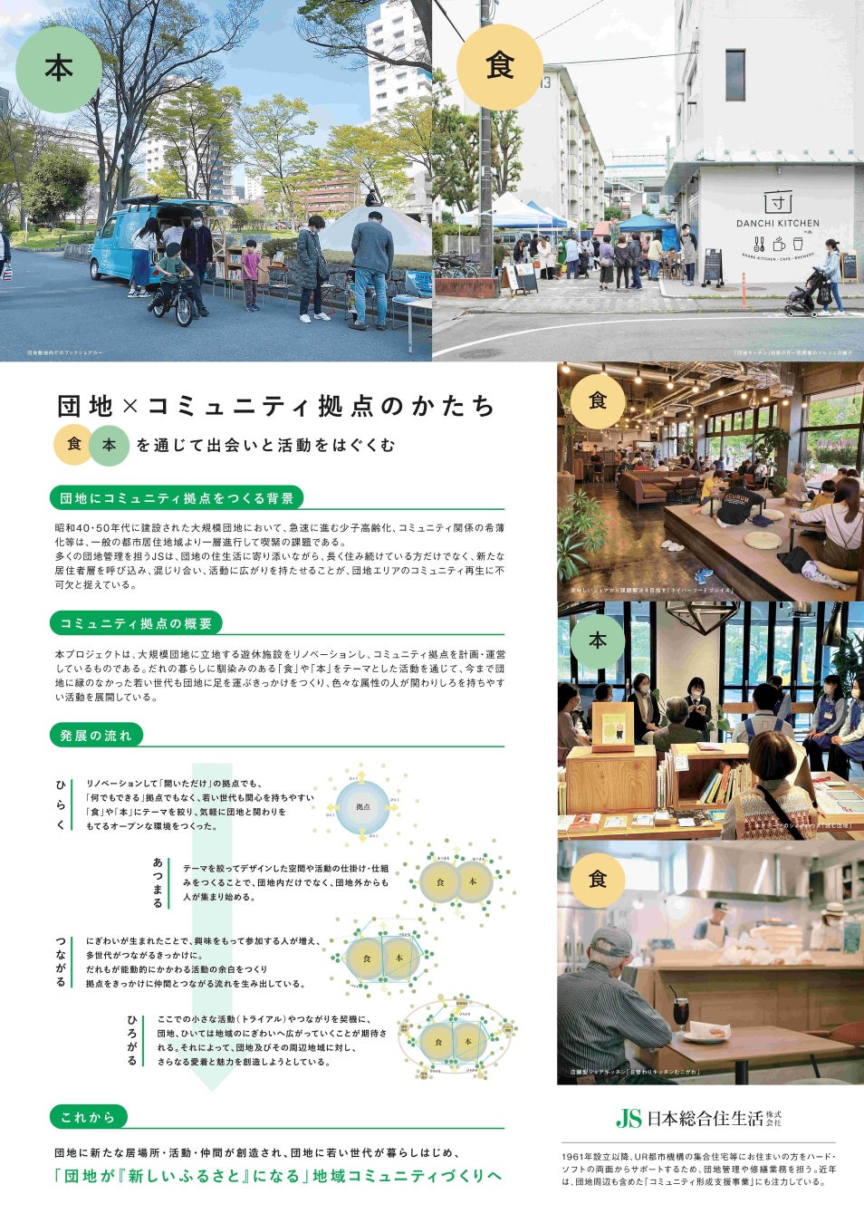 「長年URの団地の管理・修繕を担ってきた企業が、物的環境のメインテナンスだけでなく、コミュニティのメインテナンスに取り組む事業と言える。団地ごとの特性と空間資源の組み合わせに若手コミュニティ・マネージャーのアイディアを加え、その場所場所の新たなコミュニティの場が創出されている。団地をよく理解した上での多様な場づくりの大らかなトライアルが、これからのモデルを生んでいく土壌としても機能していると高く評価した。」