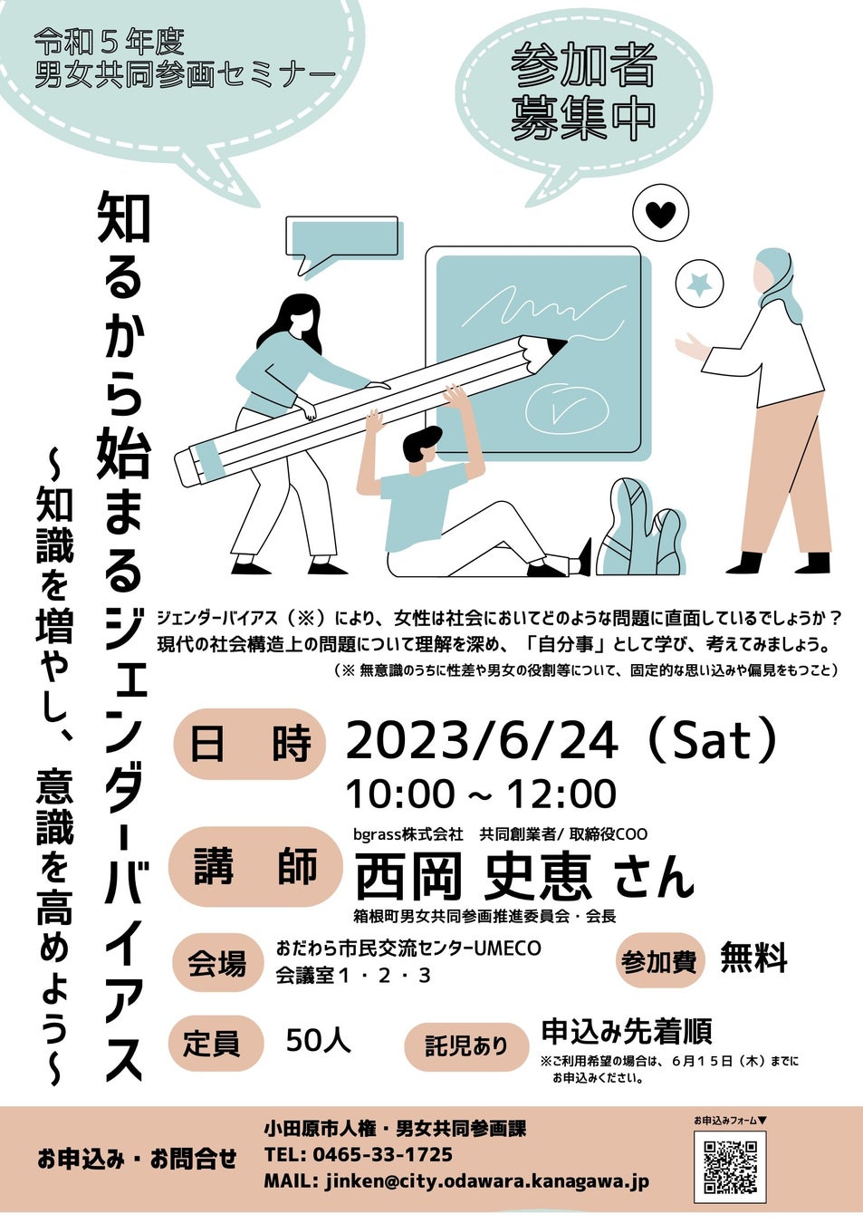 小田原市人権・男女共同参画課×bgrass株式会社「知るから始まるジェンダーバイアス~知識を増やし、意識を高めよう~」セミナーを2023年6月24日に実施!