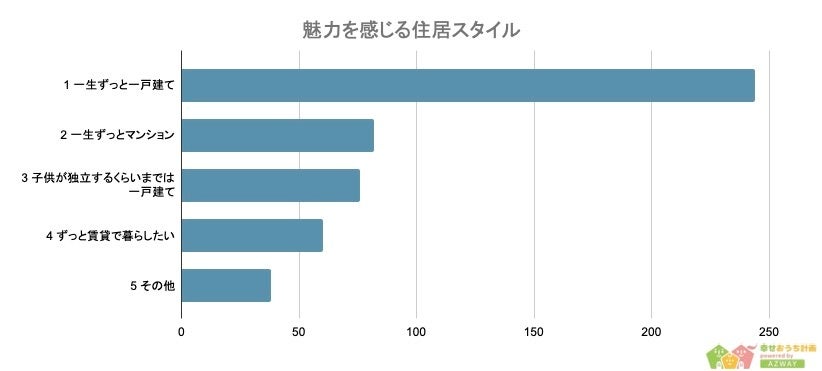 最後に複数の選択肢の中から「一番魅力に感じる暮らし方」を選んでもらったところ、1位が「一生一戸建てで暮らす(244人)」、2位が「一生マンションで暮らす(82人)」、3位が「子供が独立するくらいまでは一戸建てで暮らす(76人)」という結果になりました。