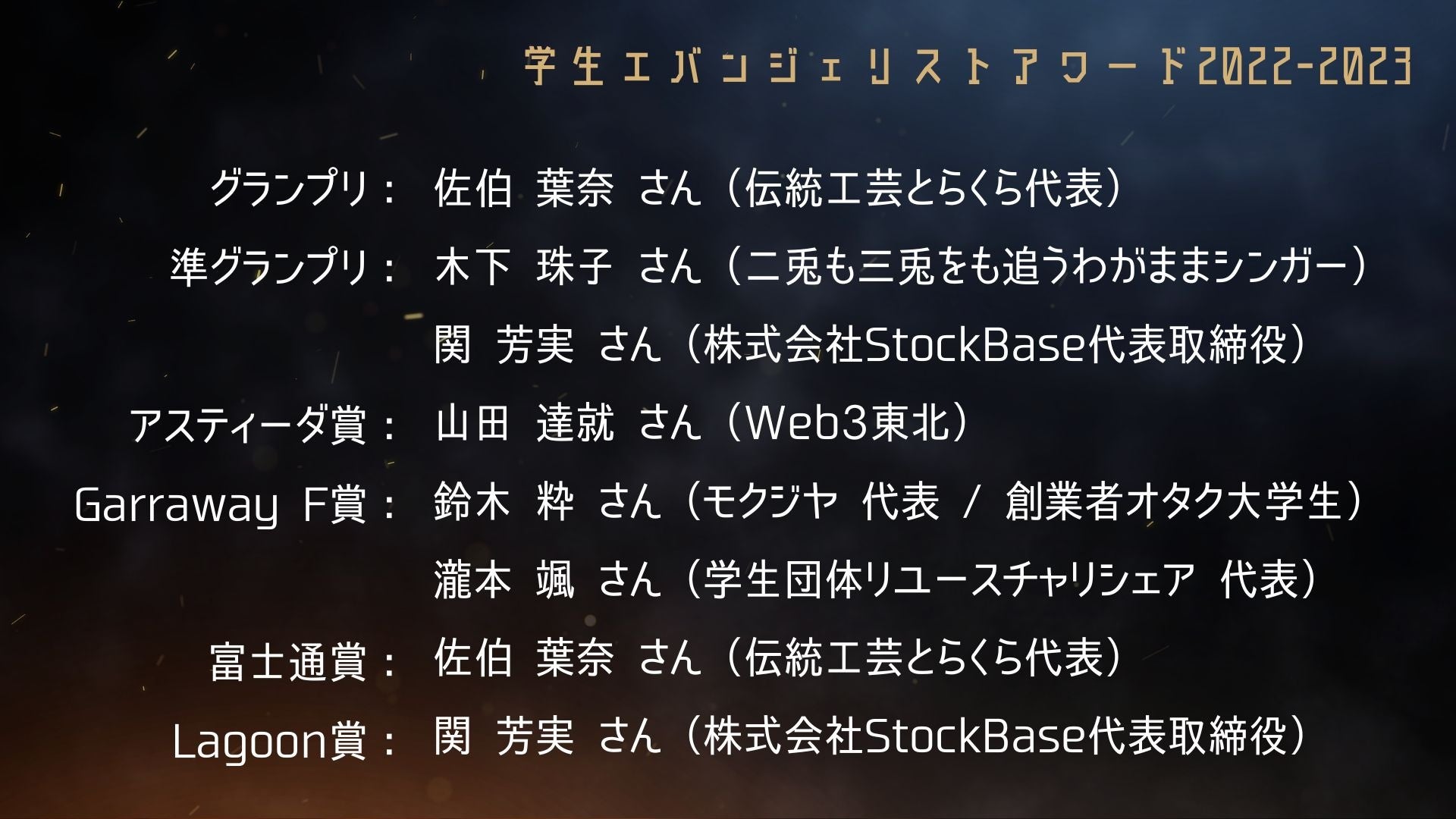 NPO法人学生ネットワークWAN(以下、「WAN」)は、2023年3月30日(木)、「学生エバンジェリストアワード 2022-2023」の受賞者をオンライン配信にて発表しました。