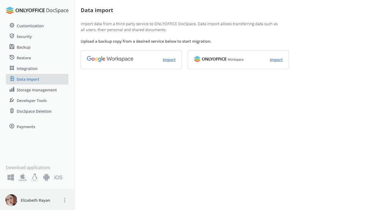 ONLYOFFICE WorkspaceやGoogle WorkspaceからDocSpaceに数クリックでデータをインポートできます。ファイル、グループ、共有ファイルやフォルダを持つユーザーをインポートすることができます。