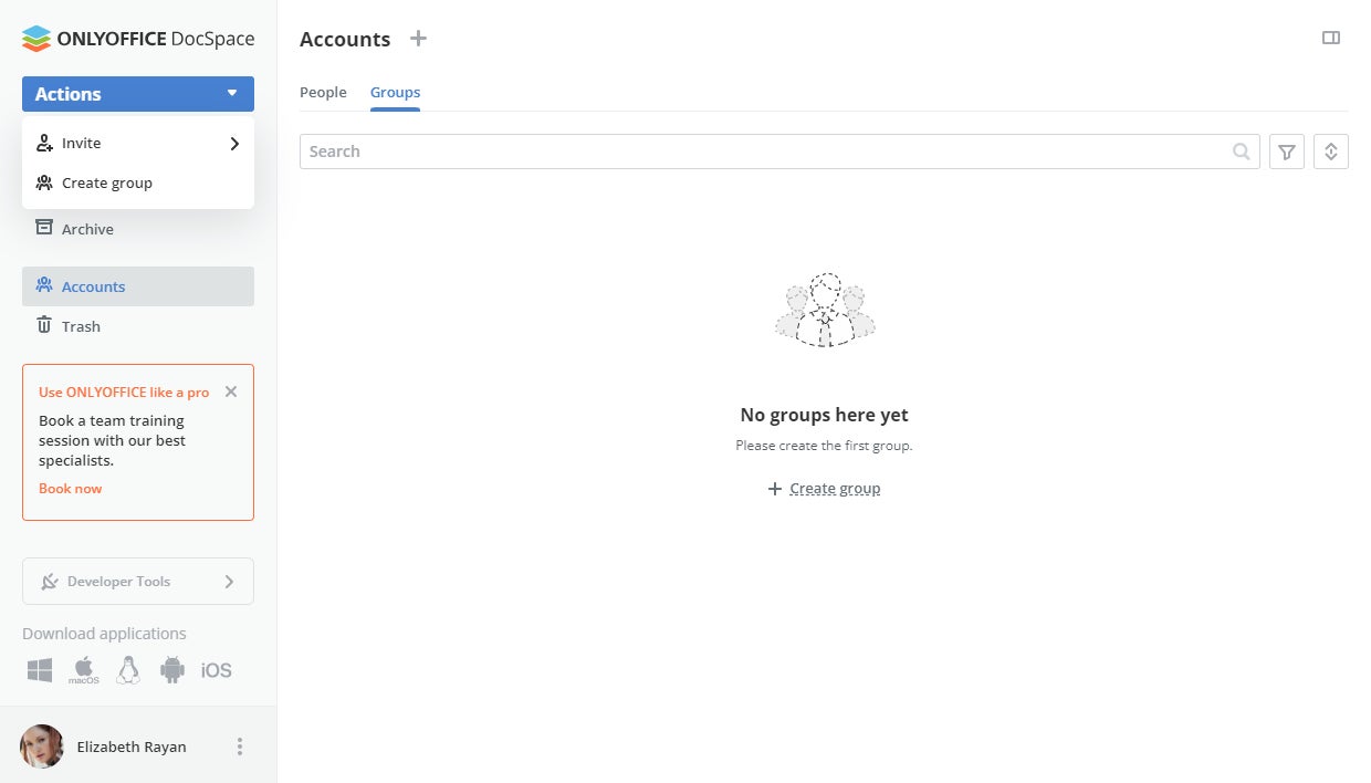 ONLYOFFICE DocSpace 2.5では、アカウント管理に便利な新機能が追加されました。より効果的なチーム管理のために、ユーザーをグループにまとめることができます。