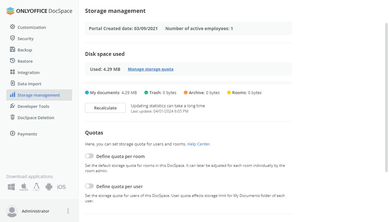 DocSpaceのディスクメモリの消費を簡単にコントロールするために、ルームまたはユーザーごとにデフォルトのストレージクォータを設定できるようになりました。