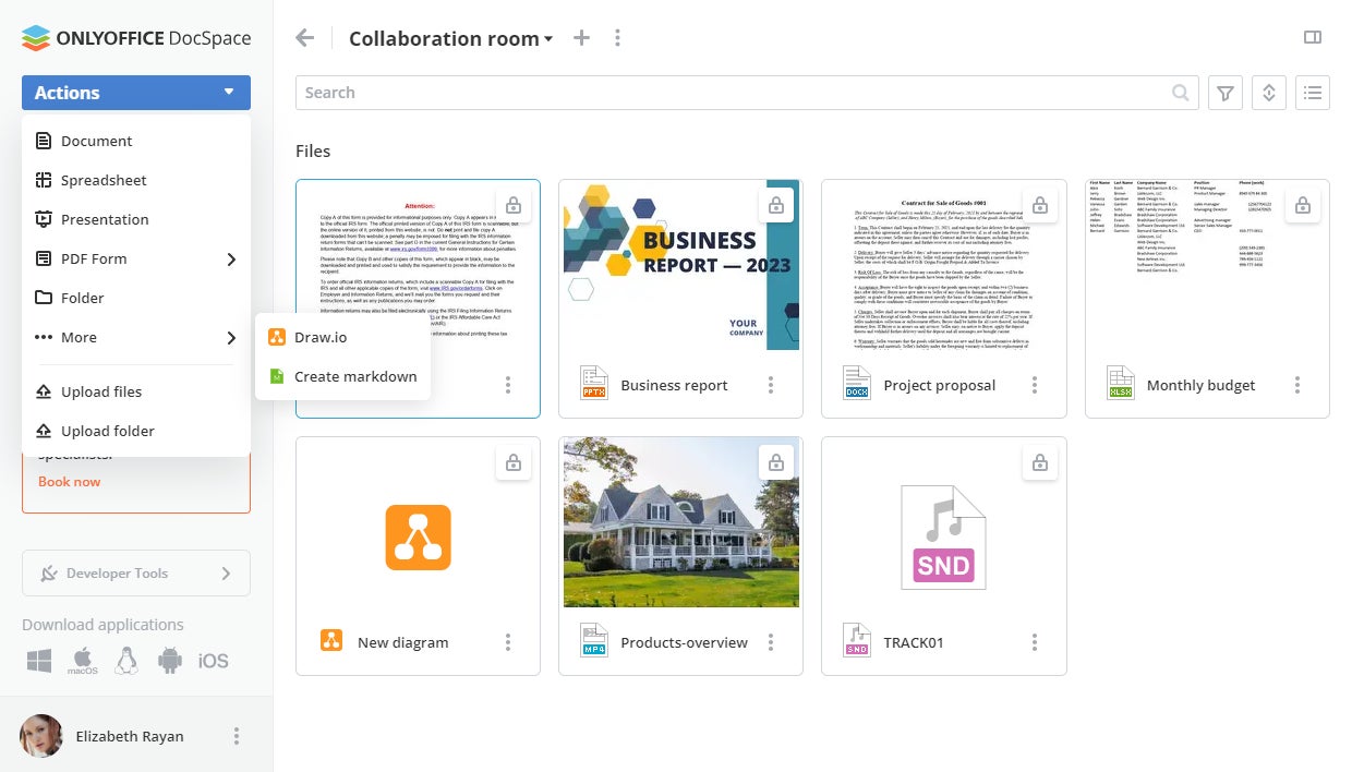 ONLYOFFICE DocSpaceでは、オフィスファイル、PDF、マルチメディアなど、あらゆるコンテンツを扱うことができます。今後は、markdown-it パーサーに基づいた新しいMarkdownプラグインにより、.mdファイルの表示、作成、編集も可能になります。