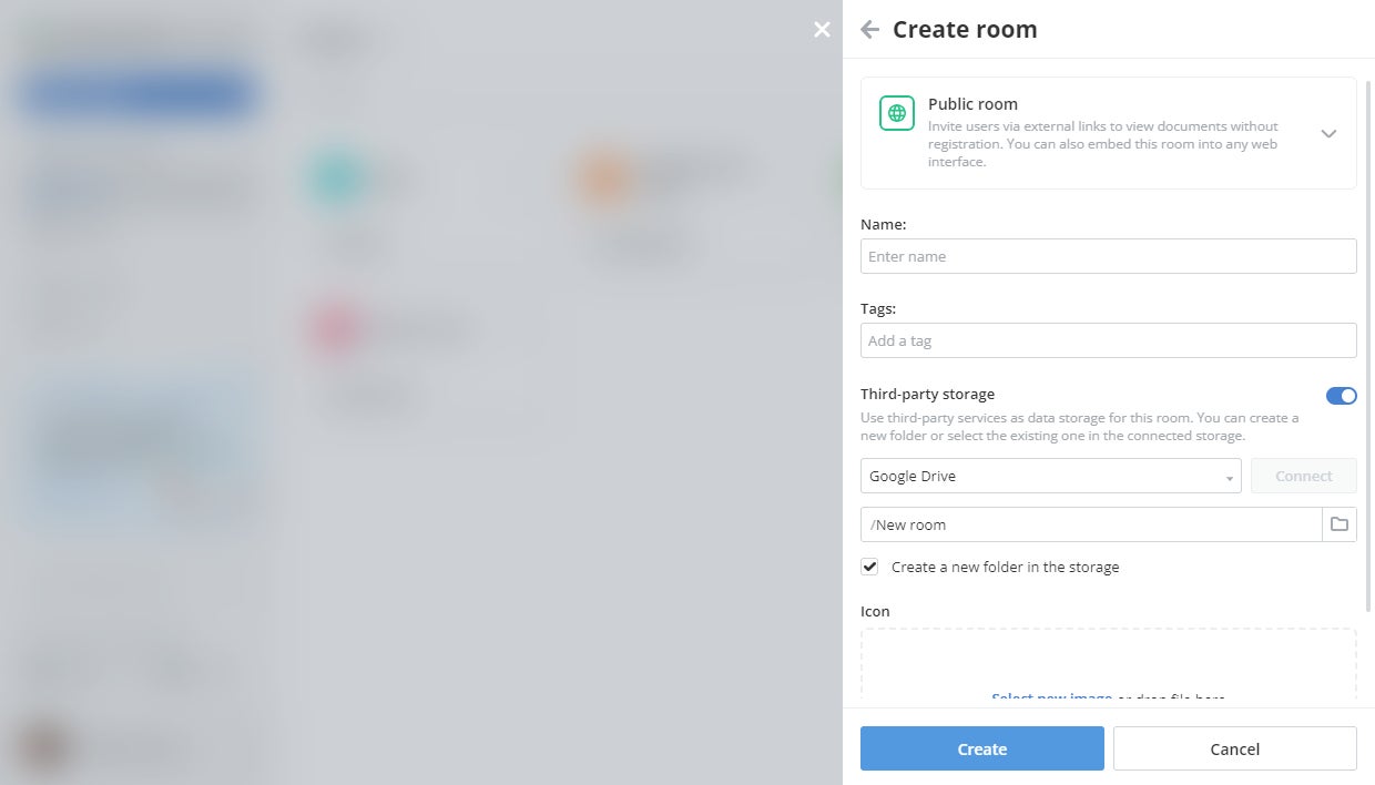 パブリックルームのデータストレージとして、サードパーティーのサービスをご利用いただけます。新しいフォルダを作成するか、接続されているストレージ内の既存のフォルダを選択します。