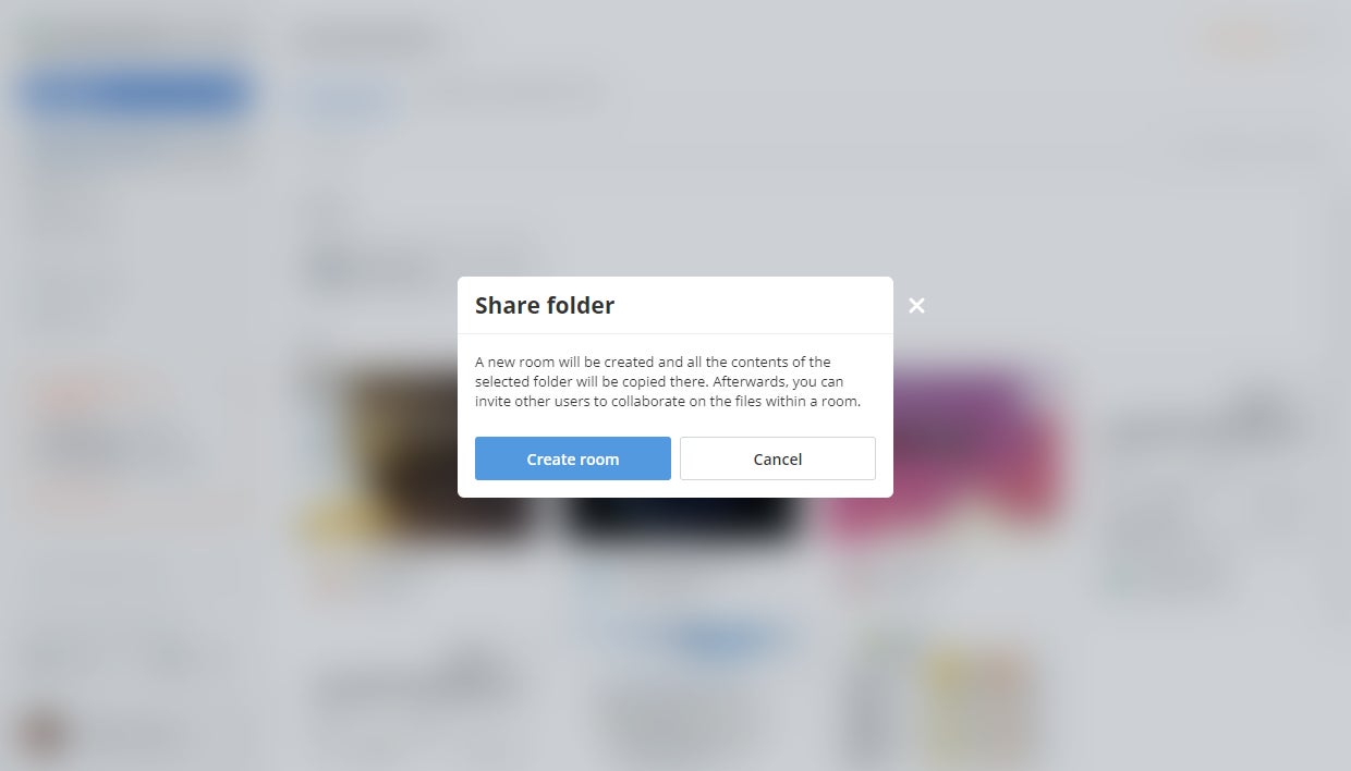 個人フォルダを共有することもできます。この場合、新しいパブリックルームが作成され、あなたのフォルダのすべての内容がそこにコピーされます。その後、他のルームと同じように、他のユーザーを招待することができます。