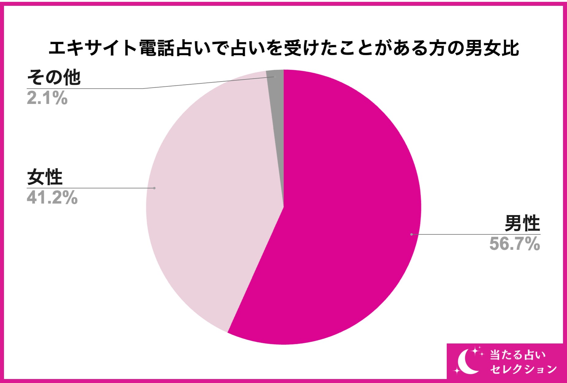 まず初めに、エキサイト電話占いで占いを受けたことがある方の男女比についてご紹介していきます。エキサイト電話占いを受けたことがある男女の比率は画像の通り、男性が約56%、女性が約41%の結果となりました。電話占いを利用する人は女性が大多数というイメージが多いかもしれませんが、約56%(半分以上)が男性という結果になりました。
