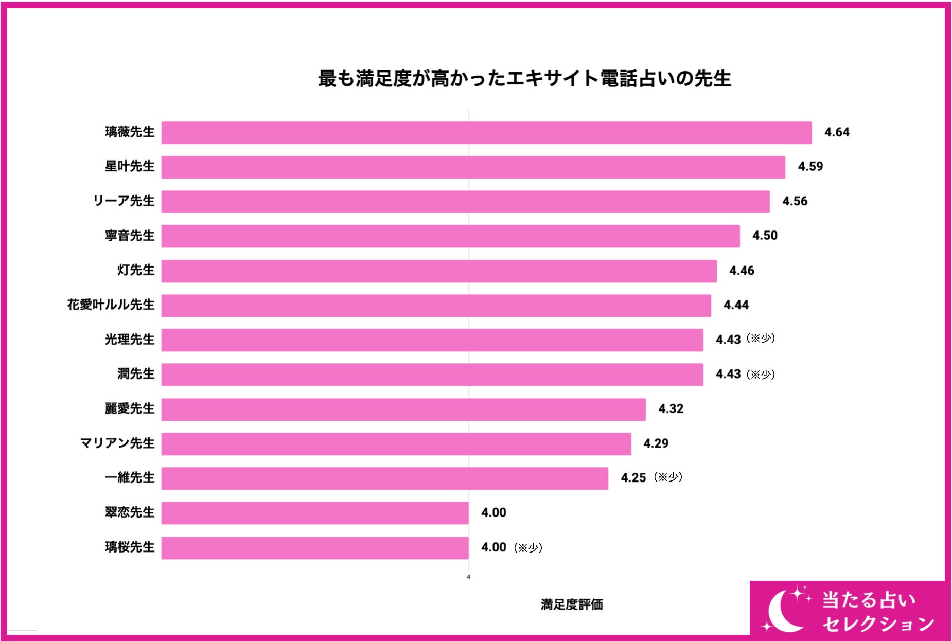 続いて、エキサイト電話占いの先生の中で最も満足度評価が高かったのはどの先生なのでしょうか?結論から言うと、画像の通り「璃薇先生」が満足度評価「4.64/5.00」で最も評価が高いことが分かりました。璃薇先生は色々な記事や占いサイトでも特集が組まれているほど人気の先生のため、評価もばらつきやすいと思っている方もいるかもしれません。ですが、アンケート結果を確認してみると総合評価では他の占い師よりも高く、口コミ数も多いことから相談がしやすい先生と言えるでしょう。