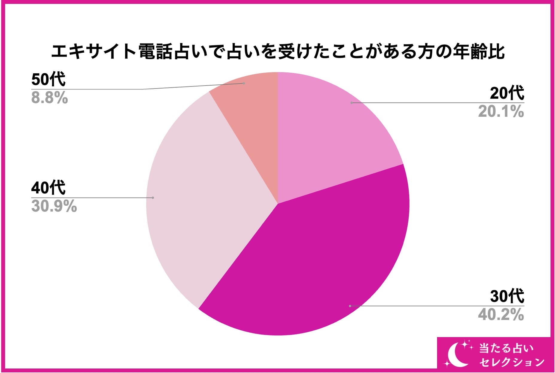 続いて、エキサイト電話占いで占いを受けたことがある方の年齢比率ですが、画像の通り、20代〜40代がメインとなっています。中でも、30代の利用者数が全体の40%とかなり多くなっています。30代になると使えるお金が多くなったり、悩み事も増えてくるため占い師にお願いする人が多いのかもしれません。