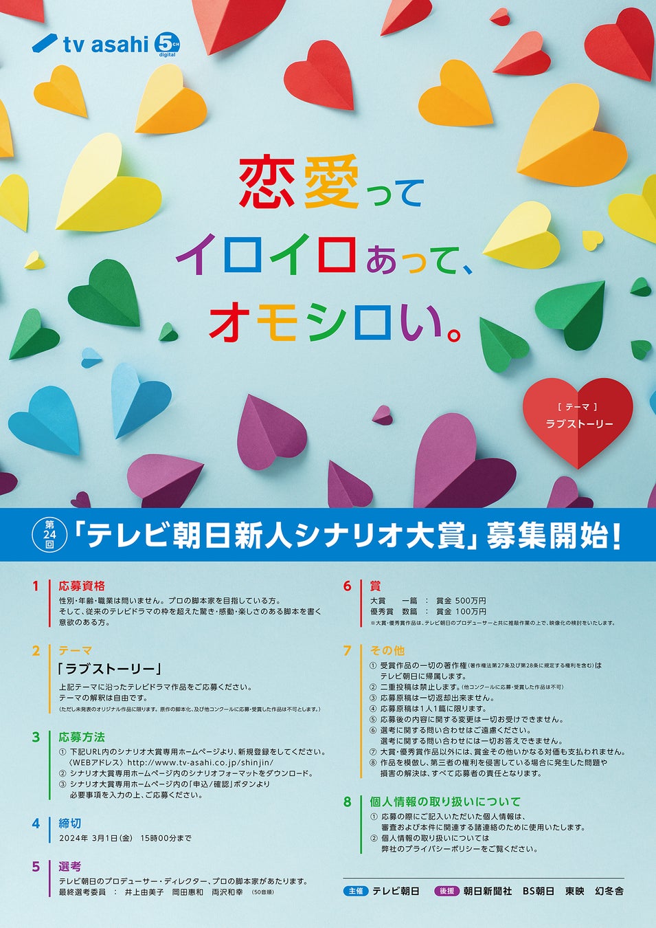 2007年7月に創設して以来、数多くのシナリオライターを輩出してきた「テレビ朝日新人シナリオ大賞」が今年も募集を開始。24回目となる今回は、前回と同じ「ラブストーリー」をテーマとしたテレビドラマ作品を募集。前回を超えるストーリーをお待ちしております。