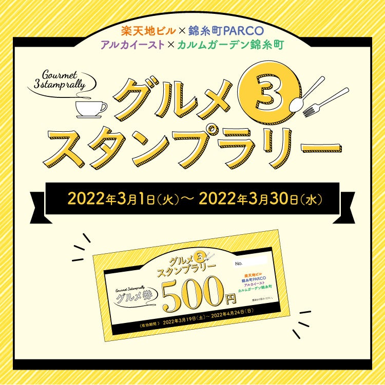 3/1~ 錦糸町エリア最大! 『グルメ3スタンプラリー』を楽天地ビル、錦糸町PARCO 他 にて開催。グルメ券500円分をプレゼント