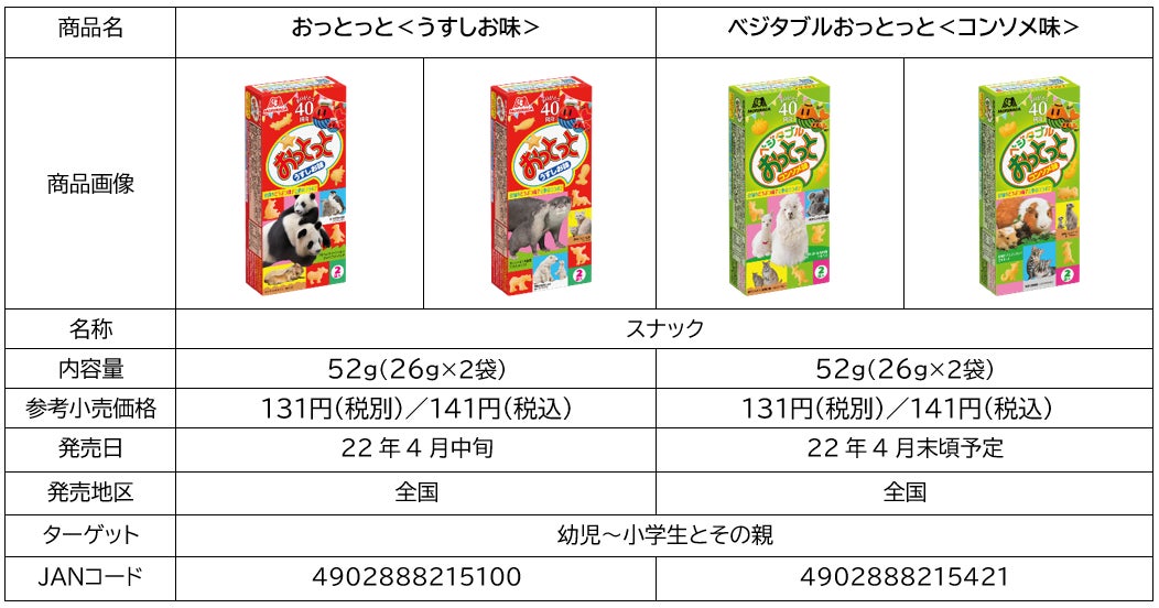 森永製菓株式会社(東京都港区芝 代表取締役社長・太田 栄二郎)は、さまざまないきもののかたちが特徴的な中空ポテトスナック「おっとっと」が40周年を迎えることを記念して、全国40か所の動物園・水族館とコラボレーションし、コミュニケーションスナック菓子として親子で楽しめる様々なコンテンツを展開します。また、新たな菓子型として、全国40か所の動物園・水族館にいる40種類のどうぶつ親子が菓子型になって新登場します。