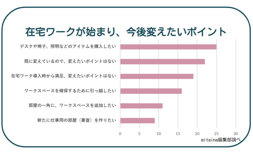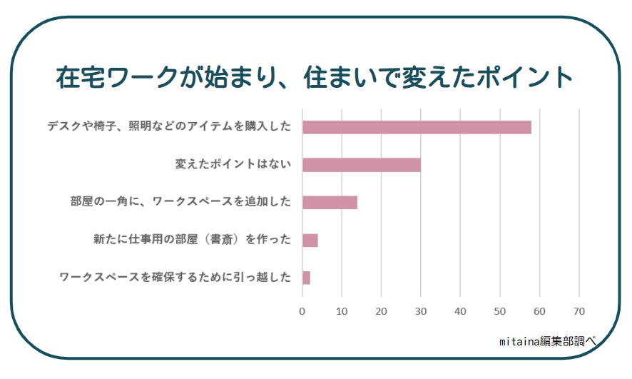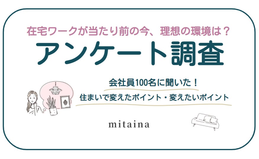 そこで株式会社I-House(本社:東京都港区)が運営する、住まいのメディア『mitaina』では、コロナ禍で在宅ワークがスタートした会社員100名にアンケート調査を実施。住まいに関して変えたポイント・今後変えたいポイントについて詳しく聞きました。