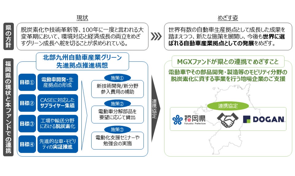 当社は令和6年7月23日に、主に九州地域の脱炭素化に資する事業に投融資することを目的とした「ドーガンMGX投資事業有限責任組合」(略称:MGXファンド、以下「本ファンド」という)を設立しております。本ファンドでは、自動車(モビリティ)分野に限らず、脱炭素化に繋がるあらゆる業種業態のソリューションや実証実験、老舗の中堅中小企業様の新規事業開発や既存製品のアップデートなど様々なプロジェクトを支援する予定であり、そのファンドを通じた投融資活動が、福岡県の北部九州自動車産業グリーン構想に貢献できると考え、本協定を締結するに至りました。