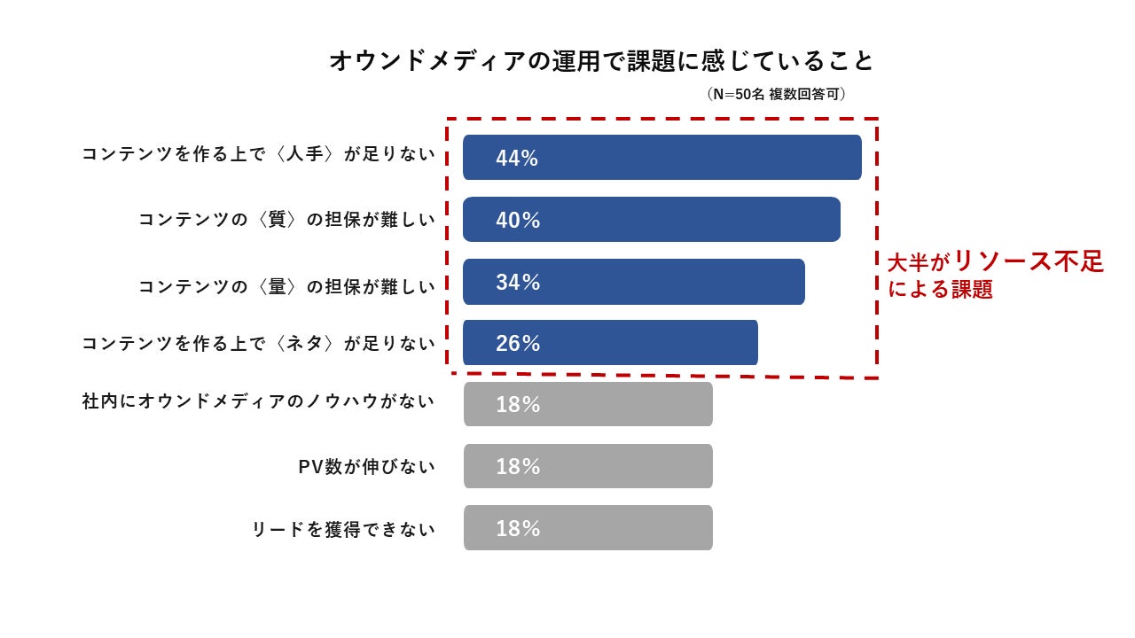 オウンドメディアの運用において、「コンテンツの質・量の担保」「人手の確保」などリソース面を課題に感じている担当者が多数