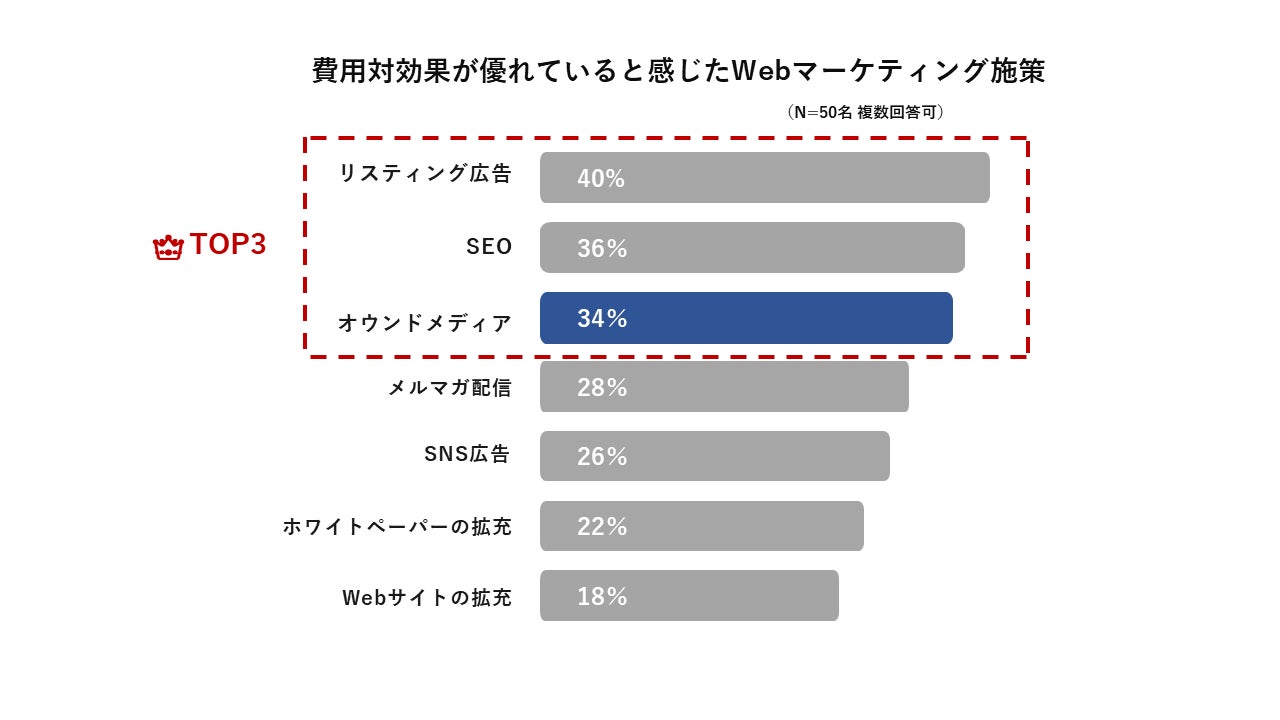 また、費用対効果が優れていると感じるWebマーケティング施策について聞いたところ、トップ3が「リスティング広告」40%、「SEO」36%、「オウンドメディア」34%となりました。リスティング広告、SEO記事制作に並んで、オウンドメディアが高い費用対効果を見込めることがわかりました。