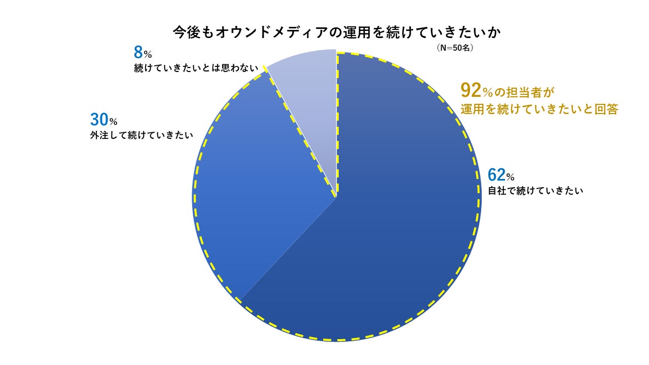 運用担当者に今後もオウンドメディアの運用を続けていきたいか聞いたところ、62%が「自社で運用を続けていきたい」、30%が「外注して運用を続けていきたい」と回答し、92%の担当者がオウンドメディアの運用を続けていきたい意思を示しました。