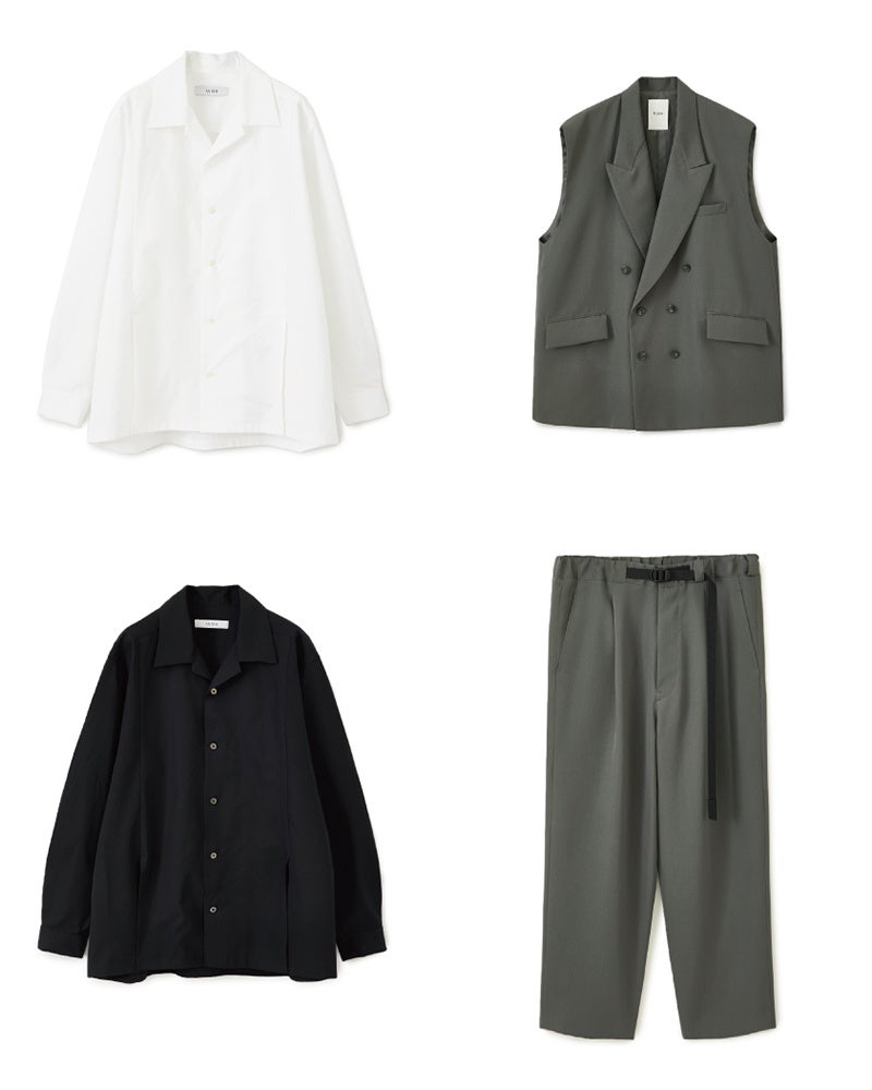 22SS コレクションにあった VEST と SLACKS を UJOH らしいウールギャバジンで表現。またフロントにスリットディテールのシャツは新デザイ ン。
