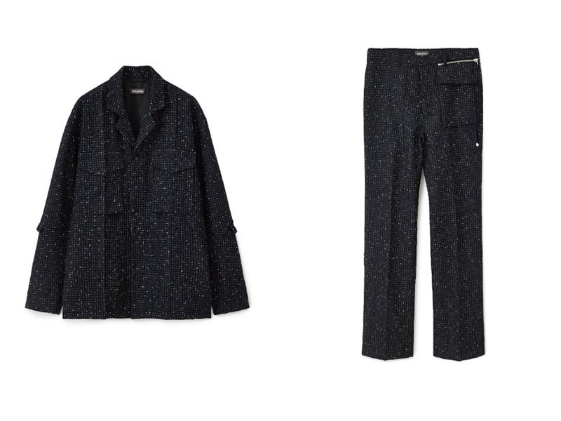 ブランドが得意としているリフレクターツイードの生地を 22SS のパターン作成したセットアップ。光を当てると反射するのも特徴。