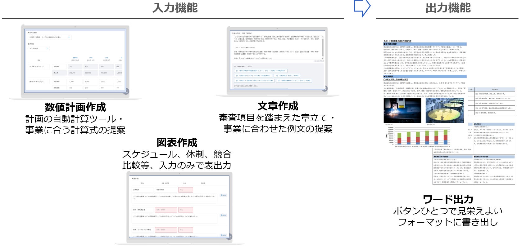 補助金申請を行う中小企業の「何を書けばよいかわからない」「自社の特徴・長所に合わせて作成したい」「手間もコストも抑えたい」というニーズを解決するクラウドサービスです。