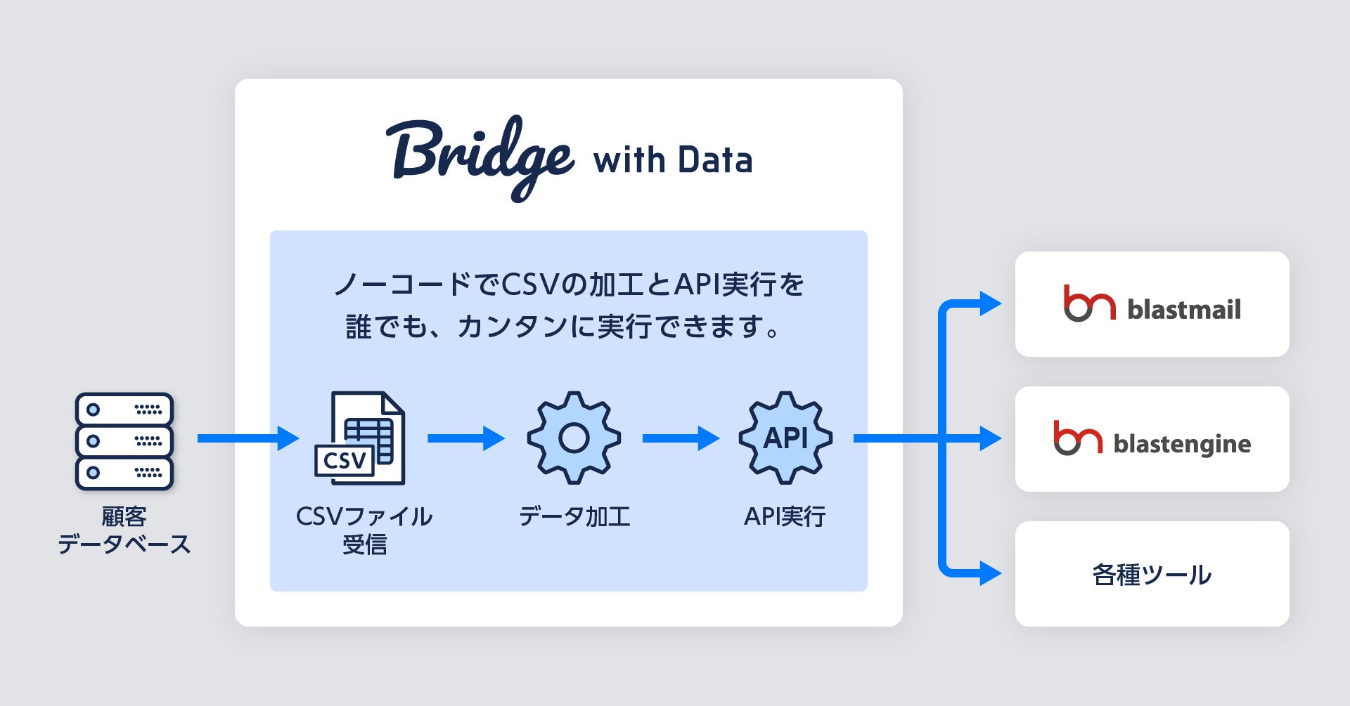 「blastmail」をご利用の事業者様は、「blastmail」とその他クラウドサービス等とのデータ連携業務の効率化を「Bridge with Data」により実現できます。これまでは、他のクラウドサービス等からエクスポートしたCSVファイルを「blastmail」へ取り込む際には、項目名の編集や必要項目の追加、不要な項目の削除などの編集が必要でした。「Bridge with Data」をご活用いただくことで、このような編集作業を自動化することができます。