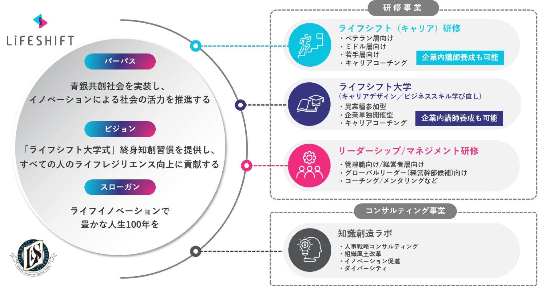 ・主な事業:企業研修/ミドルシニア層活躍に向けた組織・人事コンサルティング/社会人向け専門校ライフシフト大学運営