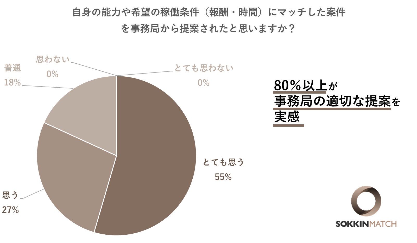 自身の能力や希望の稼働条件(報酬・時間)にマッチした案件を事務局から提案されたと思いますか?という問いに対して、80%以上が提案されていると実感しており、SOKKIN MATCHでは正確な複業人材のスキル診断が行われていることが分かりました。