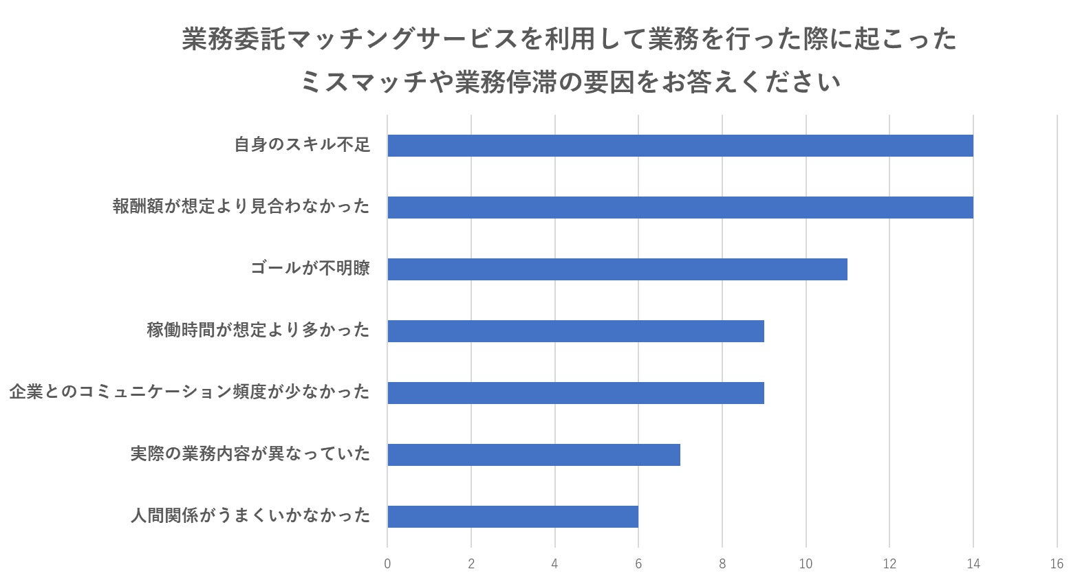 業務委託マッチングサービスを利用して業務を行った際に起こるミスマッチや業務進行の停滞の要因は「スキル不足」「稼働に見合わない報酬条件」「不明瞭な目標設計」が最も多く、全体の56%を占めました。
