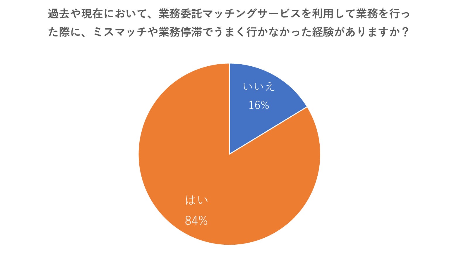 過去や現在において、業務委託マッチングサービスを利用して業務を行った際に、ミスマッチや業務進行の停滞でうまく行かなかった経験があると回答した人が84%に上りました。