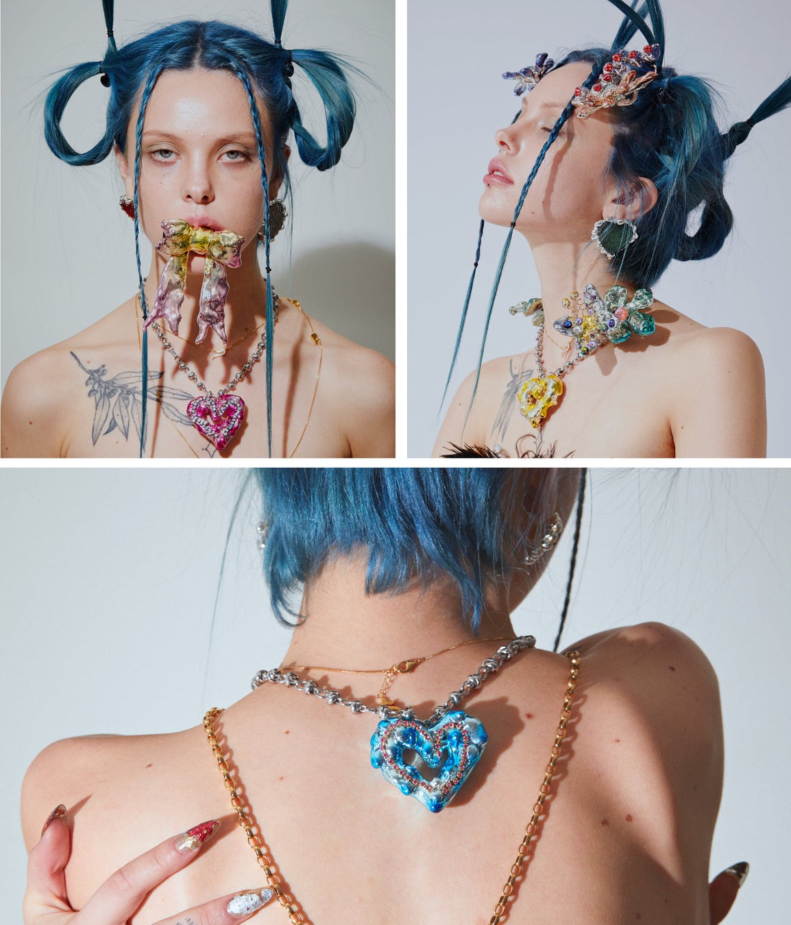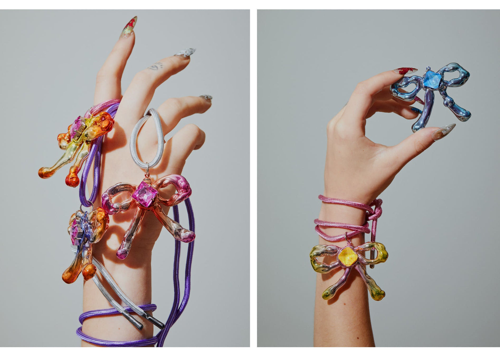 YIE YIE 23SPRINGコレクション「Ribbonned Romance」。そのテーマに沿って製作されたこのジュエリーラインには、リボンやストーン、エレガントかつ大胆なディテールのネックレスやイヤリングなどさまざまなデザインとカラーの一点物含むラインナップで構成されます。