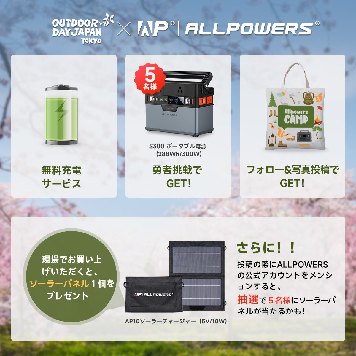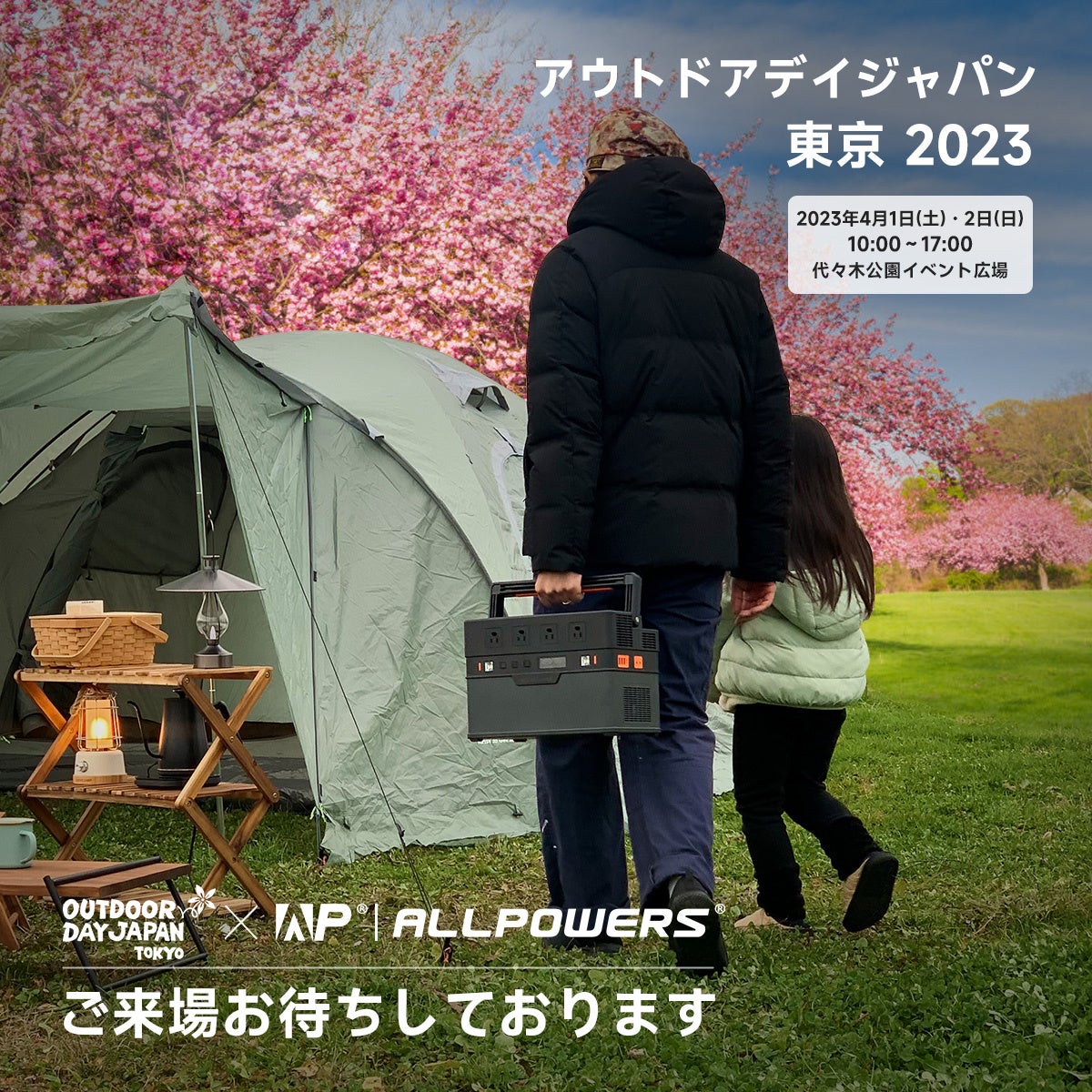 ソーラーパネルからポータブル電源までの開発・製造・販売を手掛けるALLPOWERS(オールパワーズ)株式会社は、2023年4月1日(土)、2日(日)の2日間、東京の代々木公園で開催される「アウトドアデイジャパン東京 2023」に出展します。ALLPOWERS人気製品のほか、新製品「R600ポータブル電源」を手に取ってお試しいただけます。